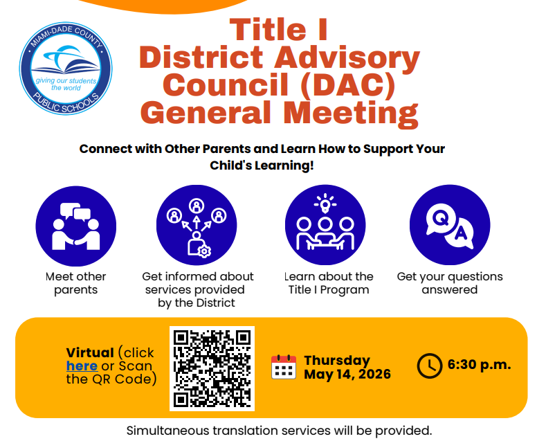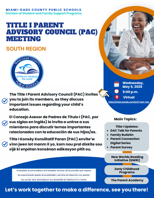 This survey is open to all parents of children attending schools implementing the Title I Schoolwide Program. Each year, the Miami-Dade County Public Schools (M-DCPS) Division of Student and Family Support Programs conducts a parent and family engagement survey to obtain feedback and information about the parent and family engagement services being provided. The purpose of the survey is to enhance and plan future support services that empower parents to better support their child’s education.